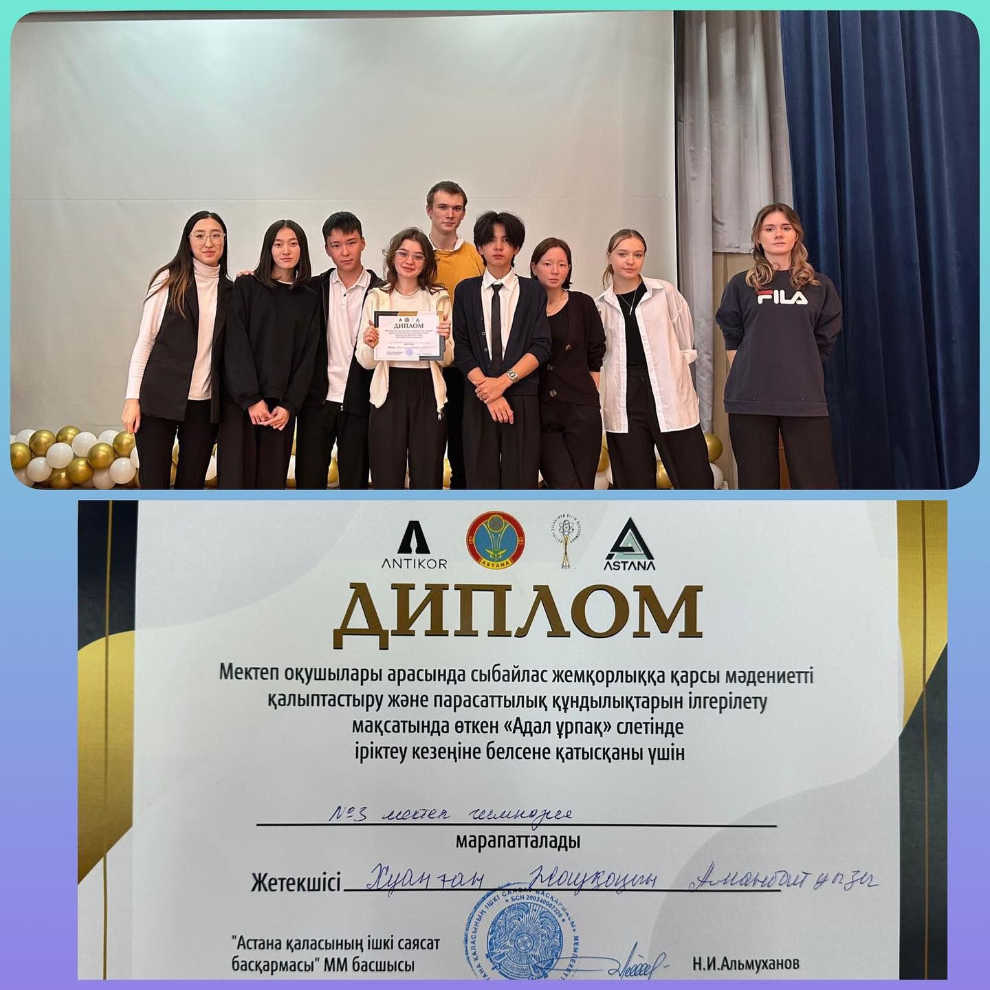 №3 мектеп - гимназия белсенділері Адал ұрпақ еріктілер клубы сыбайлас жемқорлыққа қарсы мәдениетті қалыптастыру және парасаттылық құндылықтарын ілгерілету мақсатында өткен «Адал ұрпақ» слетіне белсене қатысқаны үшін Дипломға ие болды.