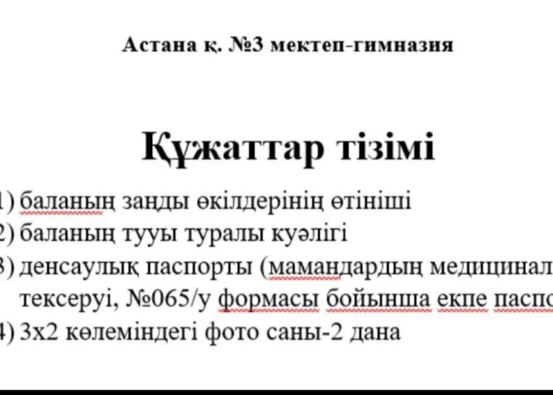 Қазақстан азаматтары үшін Жалпы білім беретін орта мектепке қабылдауға қажетті құжаттар тізімі: