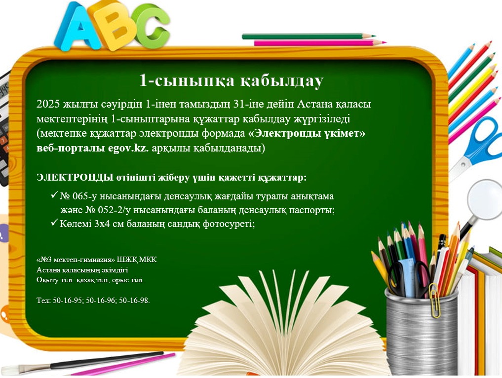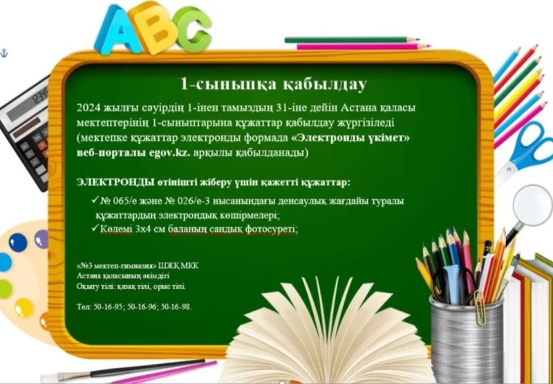 Биыл бірінші сыныпқа өтініш қабылдау 1 сәуірде басталып, 2025 жылдың 31 тамызына дейін жалғасады.