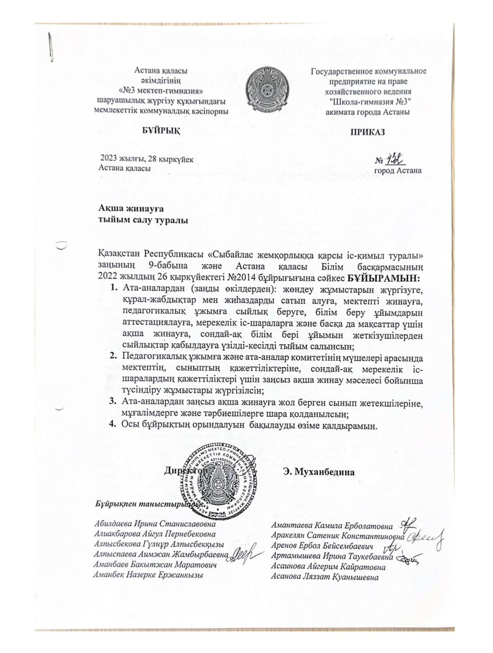 Приказ о запрете незаконных поборов денежных средств в школе - гимназии №3