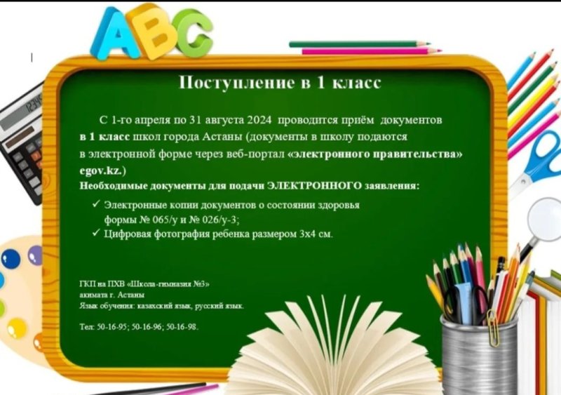 Согласно Закону РК «Об образовании» в 1 класс дети поступают с 6 лет по заявлению родителей. Документы можно подать посредством портала электронного правительства egov.kz, а также в бумажном виде с 1 апреля по 31 августа.