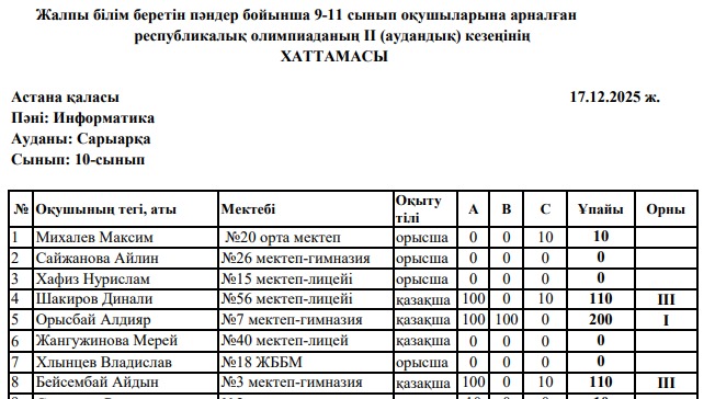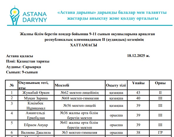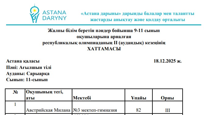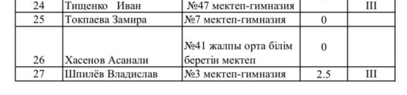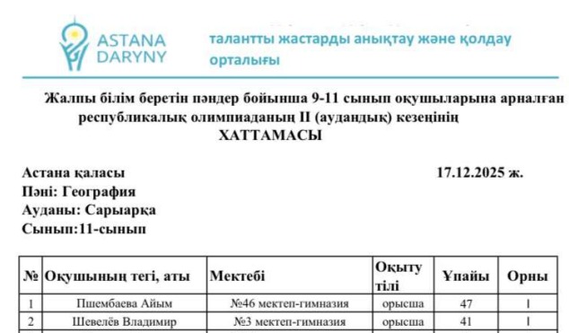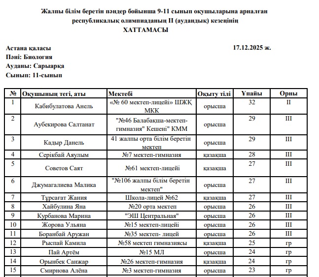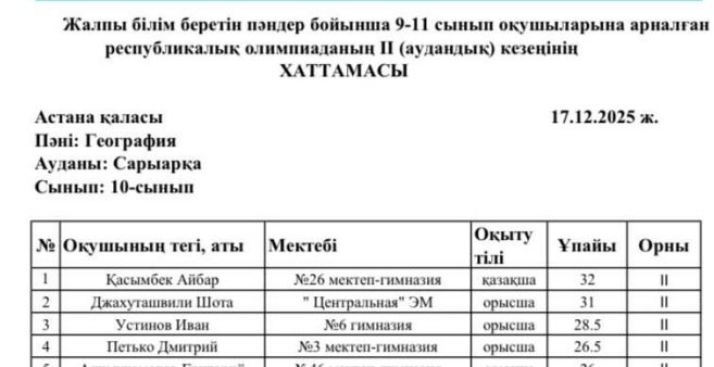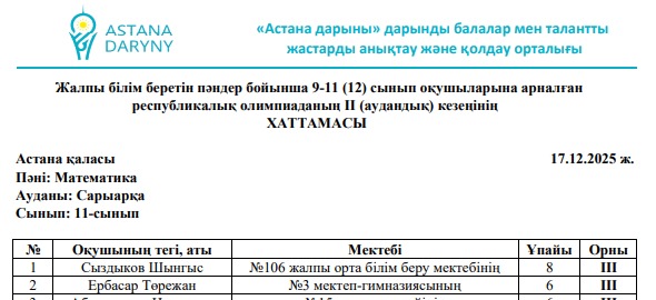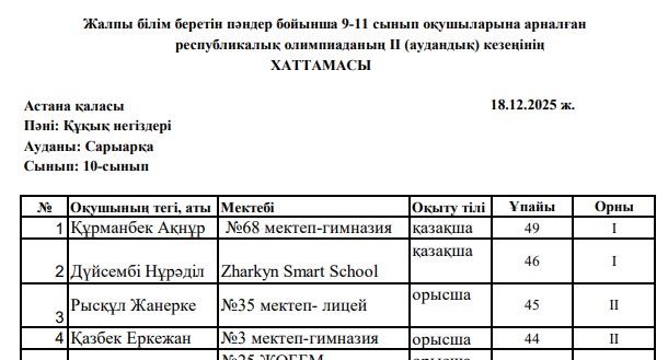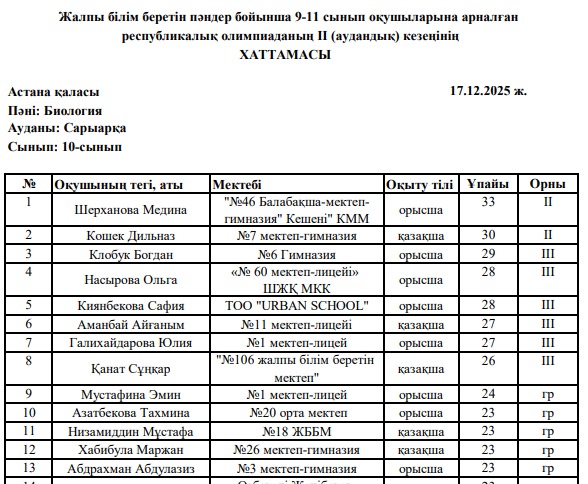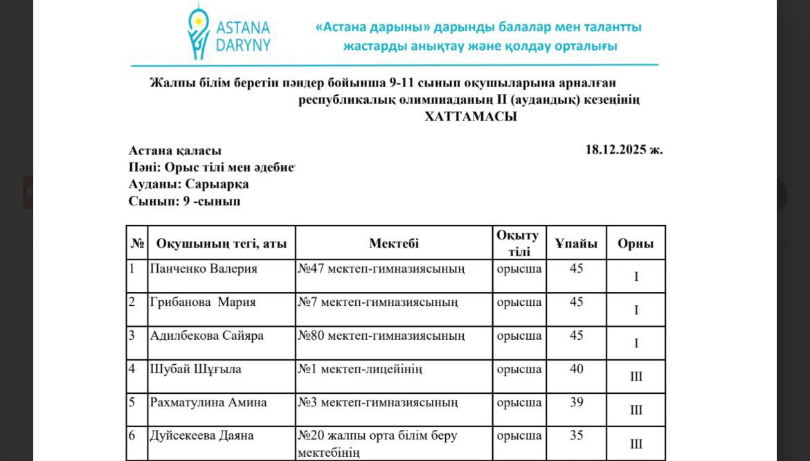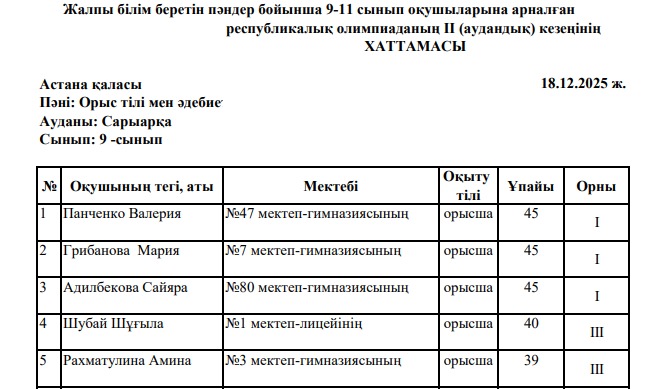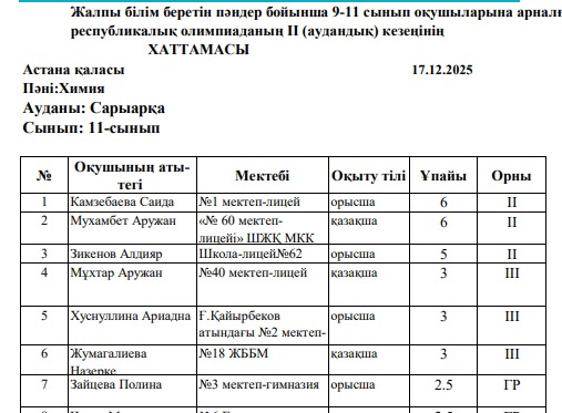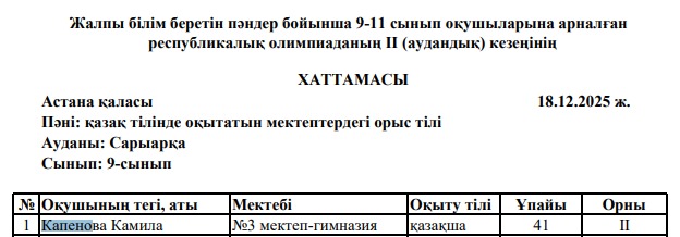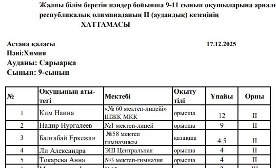 Итоги II (городского) этапа республиканской олимпиады по общеобразовательным предметам среди учащихся 9-11 классов: Бейсембай Айдын (информатика) 3-место, руководитель Рахимжанова С.М., Зайцева Полина (химия) грамота, руководитель Ускембаева Г.К., Токарева Анна (химия) 2-место, руководитель Окружко С.Н., Шойынбек Әкежан (география) грамота, руководитель Джайчиева Д.М., Петько Дмитрий (география) 2-место, руководитель Артамышева И.Т., Шевелёв Владимир (география) 1-место, руководитель Аренов Е.Б., Шпилёв Владислав (физика) 3-место, руководитель Умурзакова А.А., Абдрахман Абдулазиз (биология) грамота, руководитель Муханбедина Э.М., Смирнова Алёна (биология) грамота, руководитель Ускембаева Г.К., Ербасар Төрежан (математика) 3-место, руководитель Сагынбаев А.К., Туребек Аңсар (математика) 1 место, Руководитель Омарова Б.Ж., Валиева Джалила (История Казахстана) грамота, руководитель Салахова Е.В., Ғабдуали Рамазан (История Казахстана) грамота, руководитель Исабекова Г.К., Оралхан Аялы (право) 3-место, руководитель Исабекова Г.К., Қазбек Еркежан (право) 2-место, руководитель Жакыпбекова С.А., Жекен Оразгүл (қазақ тілі) грамота, руководитель Макишева З.М., Аширбекова Анара (казахский язык) 3-место, руководитель Жумабаева З.М., Рахматулина Амина (русский язык) 3-место, руководитель Крючкова Т.В.,Прокофьева Виктория (русский язык) 2-место, руководитель Жетубаева А.А.,Муратова Айлана (русский язык) грамота, руководитель Бегимбаева Б.Т., Капенова Камила (орыс тілі) 2-место, руководитель Жетубаева А.А., Алтай Мерей (ағылшын) 1-место, руководитель Байтасова М.Ш., Австрийская Милана (ағылшын) 3-место, руководитель Джанбаева Г.К.